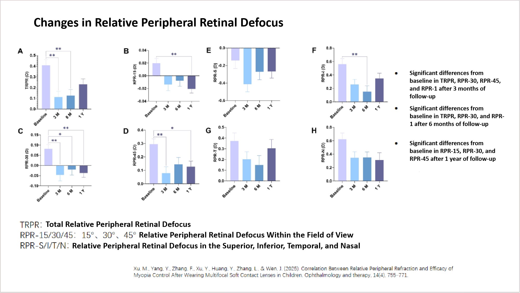 The results showed that after just 3 months of wearing MiSight contact lenses, multiple RPR indicators in children had significantly decreased, and these changes (ΔRPR) were negatively correlated with axial length growth rate. Among them, ΔTRPR and ΔRPR-45 showed the strongest correlation (r = -0.43). Changes in inferior and nasal retinal RPR also effectively reflected the trend of axial elongation, indicating that early RPR changes can predict myopia control outcomes.