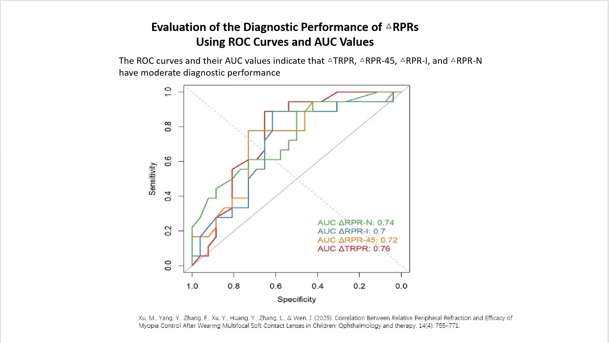 ROC curve analysis showed that the AUC values of ΔTRPR, ΔRPR-45, ΔRPR-I, and ΔRPR-N ranged from 0.70 to 0.76, indicating moderate diagnostic value. Among them, ΔTRPR had the highest AUC (0.76), making it a reliable indicator for predicting rapid axial elongation and providing a quantitative basis for identifying high-risk children and developing individualized intervention strategies.
