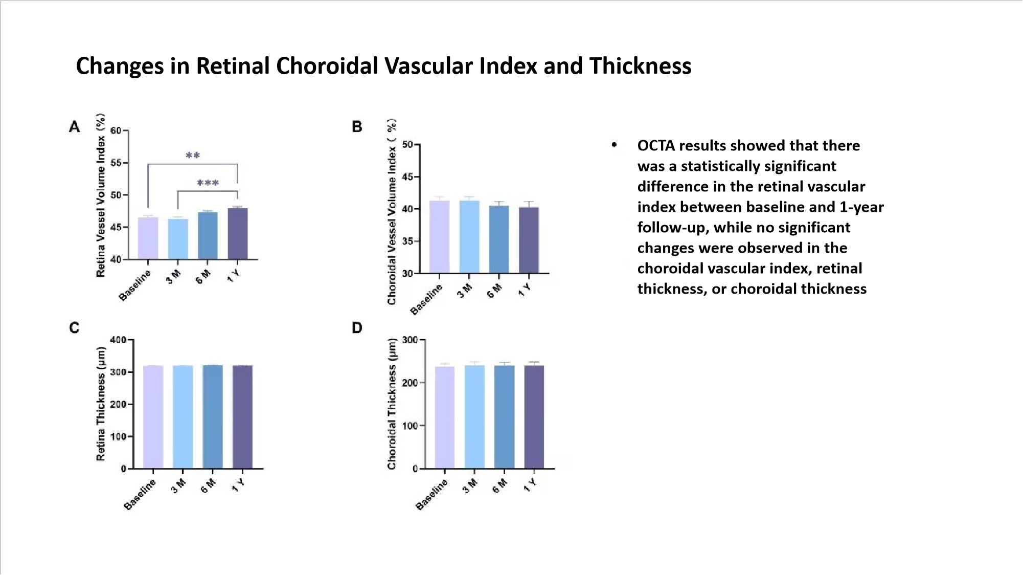In contrast to the early response of RPR, significant changes in the retinal–choroidal vasculature were observed only after one year: the retinal vessel volume index (RVI) increased, while the choroidal vessel volume index (CVI), retinal thickness (RT), and choroidal thickness (ChT) showed no significant fluctuations. This suggests that retinal vascular changes may reflect a long-term mechanism of myopia control, whereas short-term assessments should focus more on RPR.