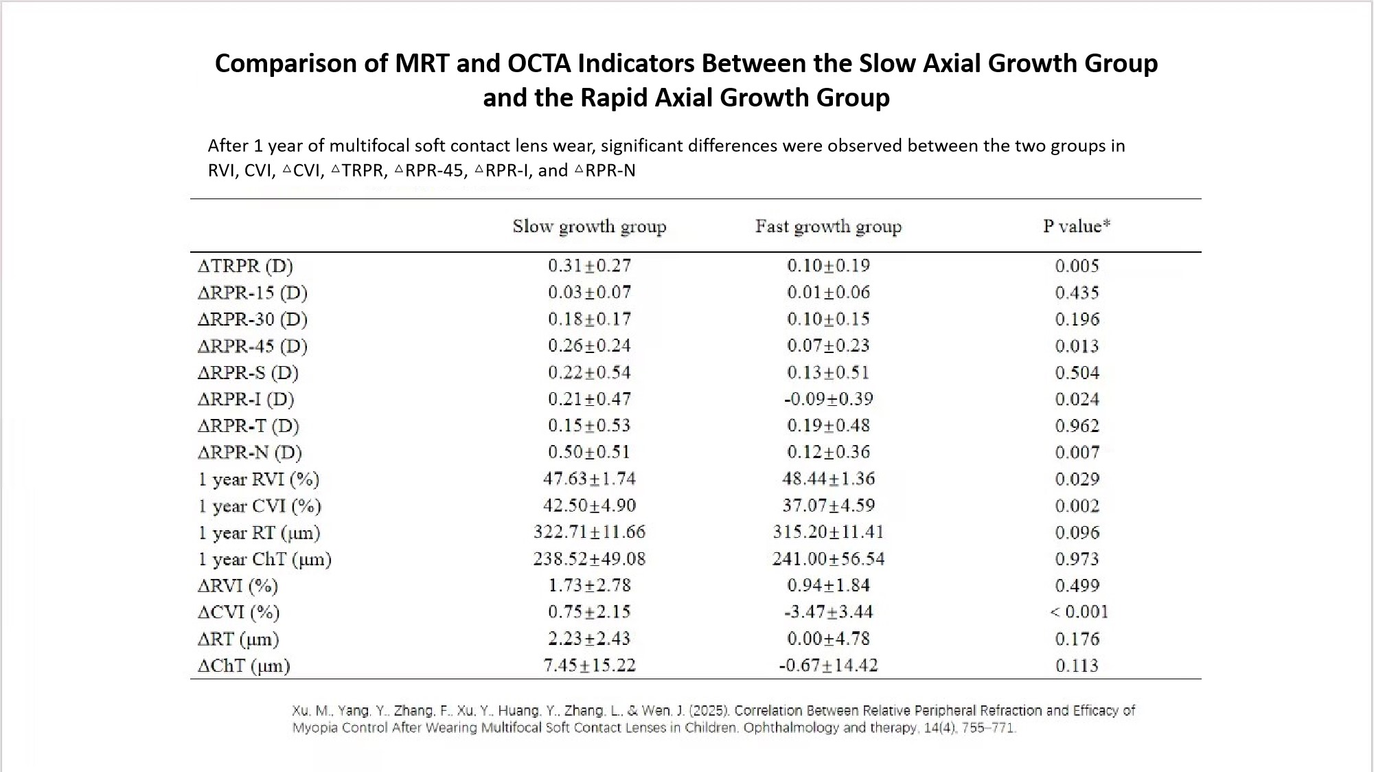 Professor Zhang’s team conducted a prospective observational study involving 44 myopic children aged 7–16. Using MRT and OCTA, they tracked changes in peripheral refraction (RPR), retinal-choroidal vasculature, and axial length at 0, 3, 6, and 12 months after wearing MiSight contact lenses, aiming to clarify the relationship between RPR changes and myopia control outcomes.