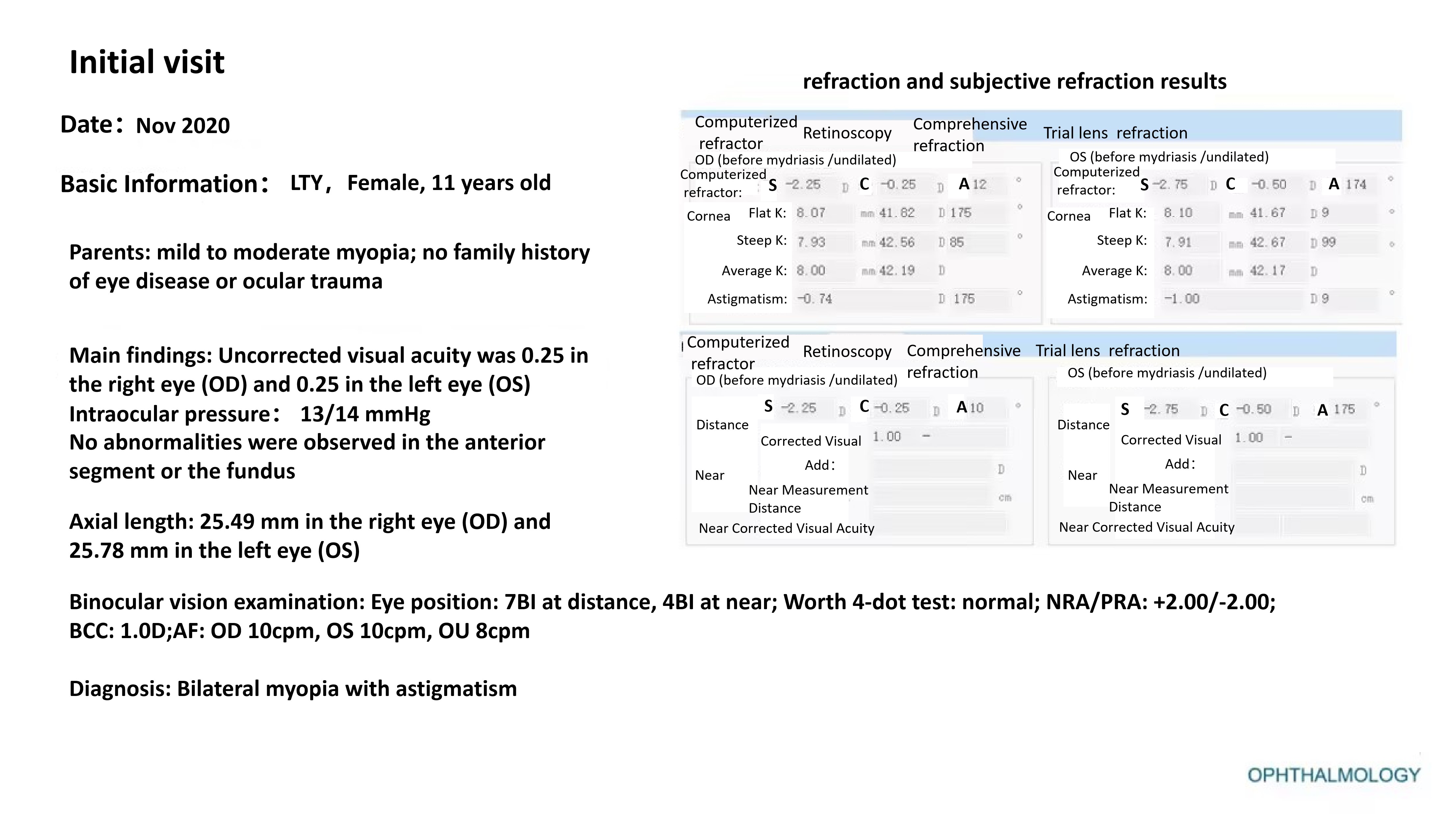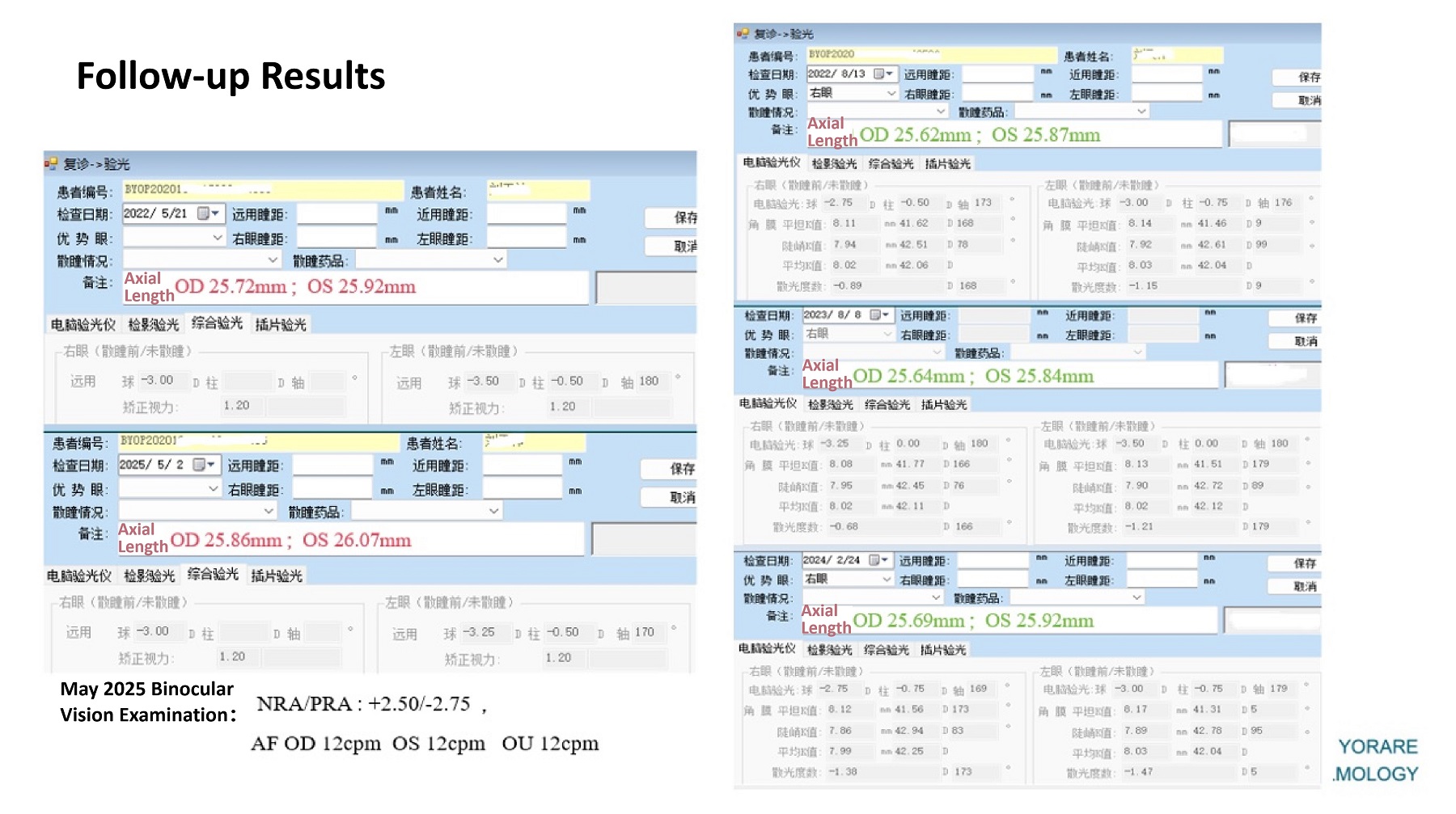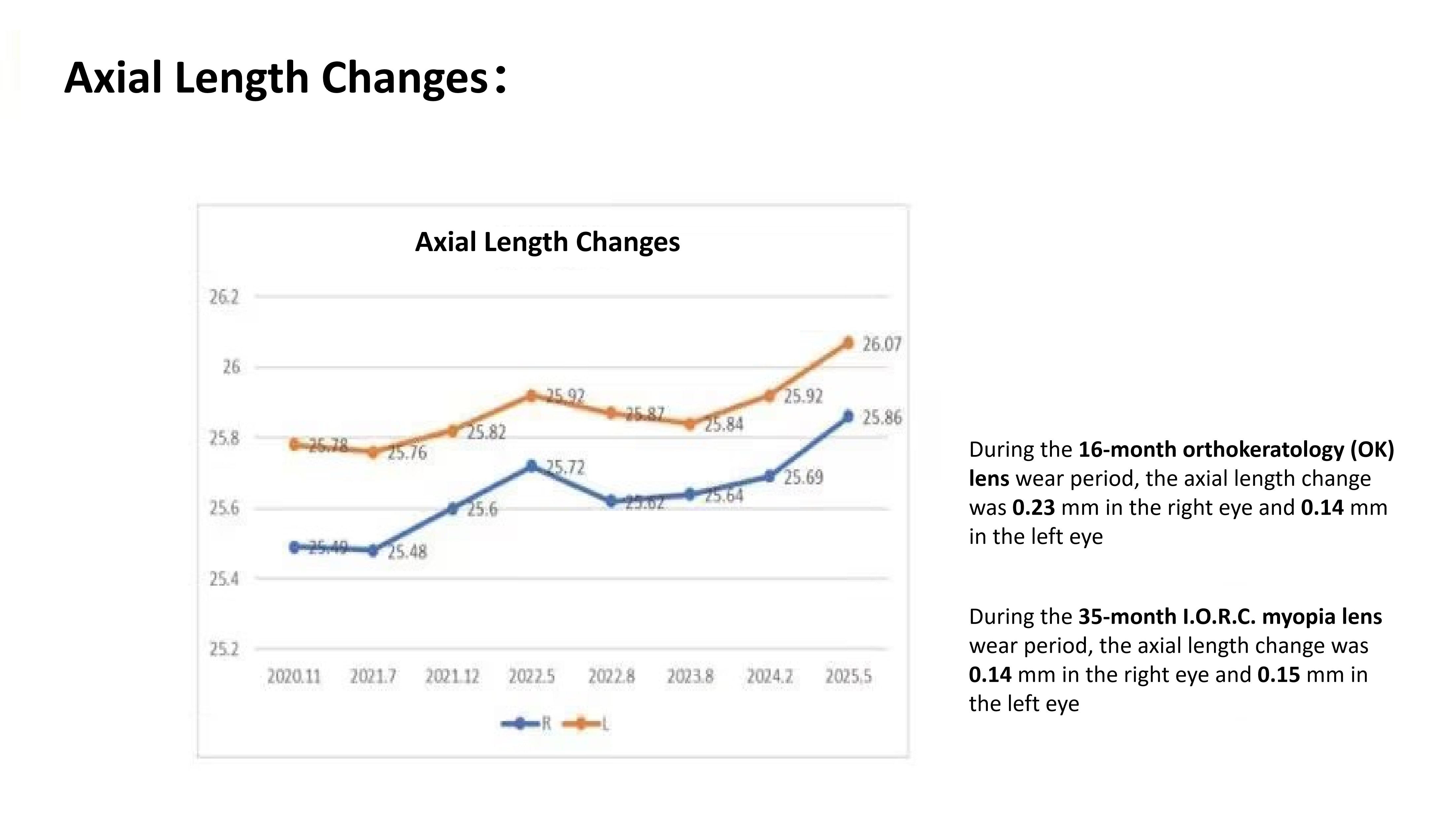 Director Lina Yang from Beijing Remote Vision presented a highly valuable clinical case. In this case, an 11-year-old myopic patient initially wore orthokeratology (OK) lenses for 16 months. Due to rheumatic myocarditis, lens wear was discontinued for 1.5 months, after which the patient was switched to defocus spectacles customized based on MRT data (I.O.R.C. defocus lenses), with continuous follow-up for 35 months (nearly three years). The follow-up results demonstrated zero progression in myopic refractive error. Axial length control was excellent, with an increase of only 0.14 mm in the right eye and 0.15 mm in the left eye. Binocular visual function also showed significant improvement, with parameters such as accommodative facility reaching target levels.