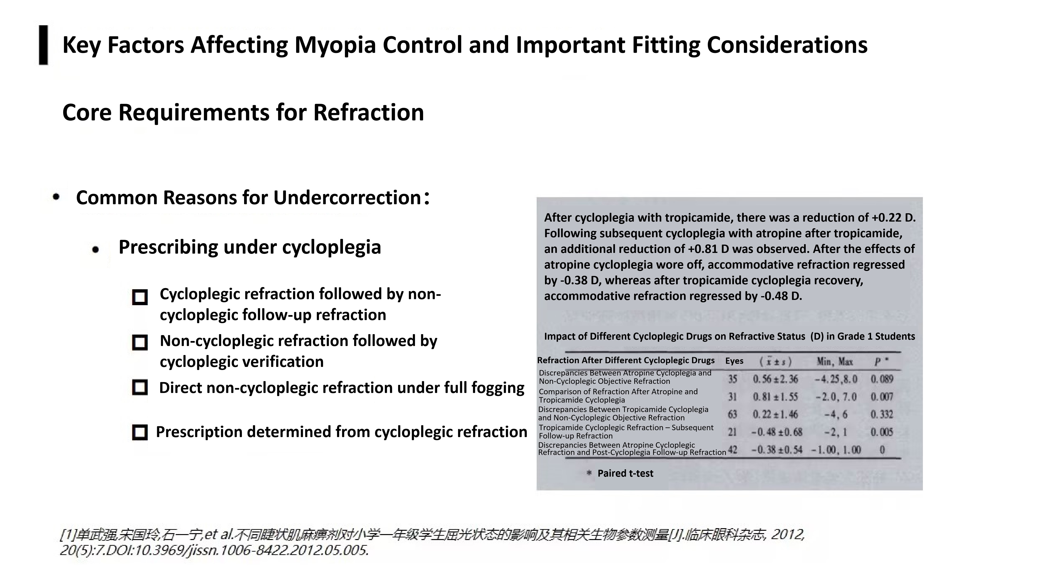 Dr. Xuechuan Dong from Thondar focused on the core fitting techniques for I.O.R.C. defocus-customized spectacles, breaking down the key points that improve myopia control effectiveness from a clinical practice perspective. Dr. Dong clearly pointed out that undercorrection is a major pitfall in myopia management: it not only directly compromises control efficacy but may also create the false impression of rapid myopia progression. He emphasized that prescribing spectacles immediately after cycloplegic refraction can easily lead to undercorrection. Clinicians should follow the MPMVA principle (the minimum prescription that achieves best-corrected visual acuity) or confirm with a post-cycloplegic small-pupil refraction before issuing the prescription.